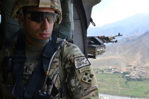 | Image fournie par l'armée américaine de Florent A. Groberg à bord d'un hélicoptère Black Hawk dans la province de Kunar en Afghanistan en 2012. |