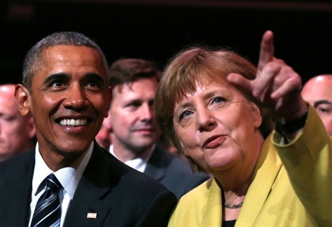 | Barack Obama et Angela Merkel, le 24 avril à Hanovre, en Allemagne. |