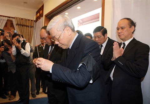 | Le secrétaire général du PCV, Nguyên Phu Trong (premier plan), rend un dernier hommage à Nguyên Bá Thanh |
