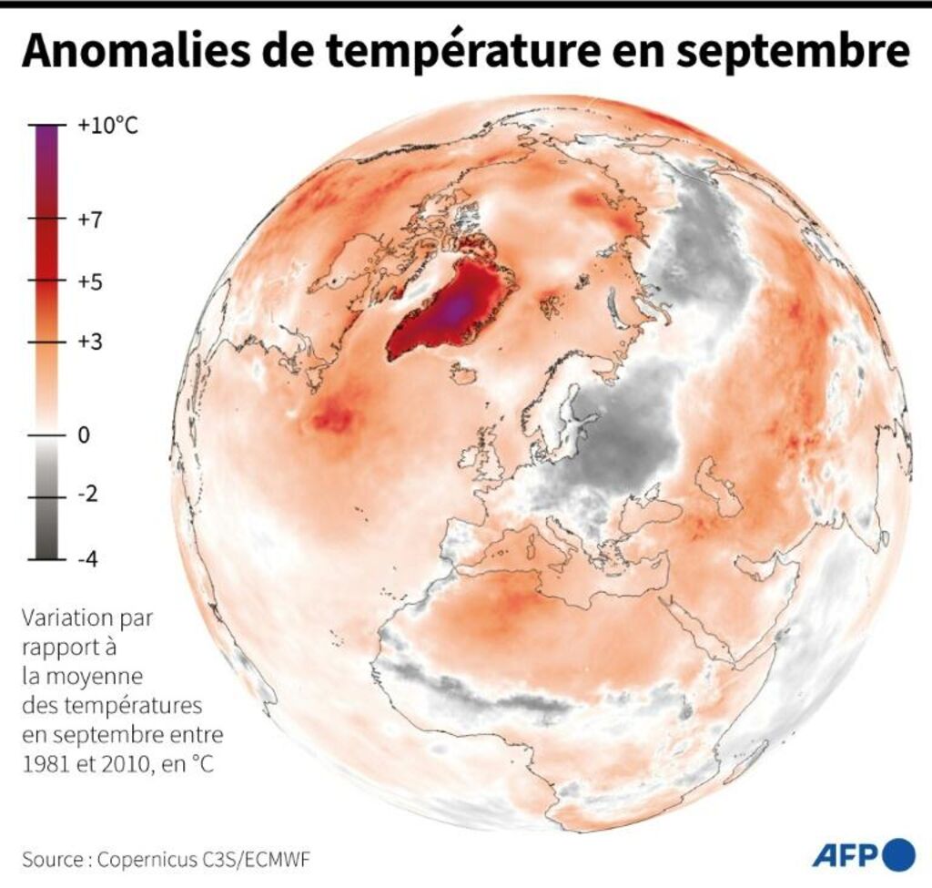 | Carte mondiale des anomalies de température enregistrées en septembre 2022. |