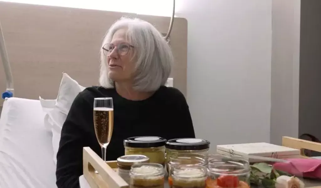 "C'est un vrai bonheur. Ça fait un peu du baume au cœur après avoir été angoissée et stressée pendant trois semaines à partir du moment de l'IRM jusqu'au moment de l'opération", acquiesce Fabienne Sanchez, retraitée de 65 ans, en levant sa coupe en compagnie de son conjoint, quelques heures à peine après l'ablation d'un papillome au sein droit.