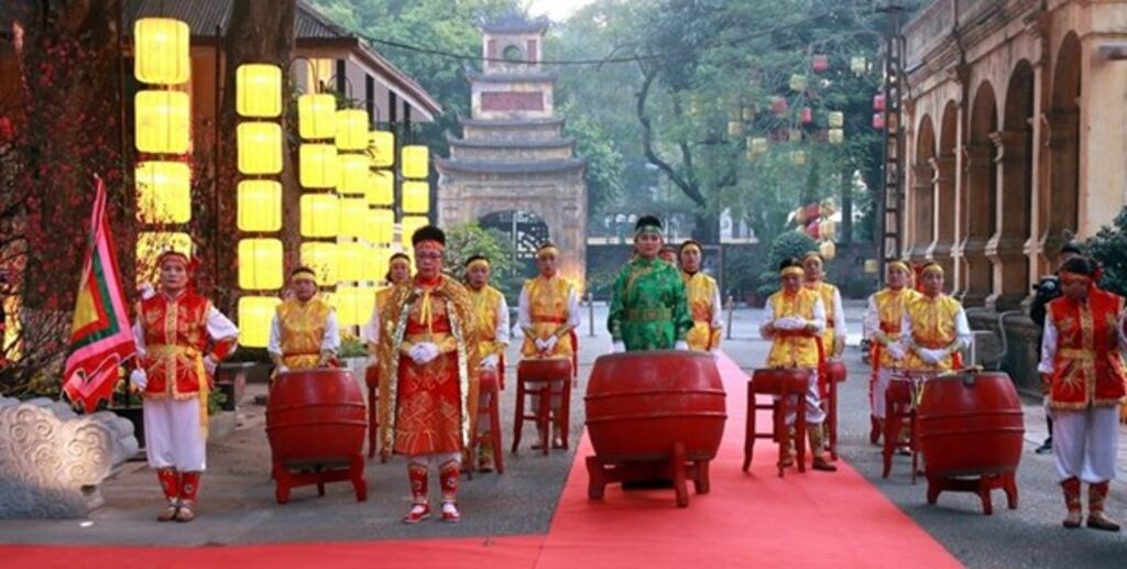 La cérémonie a débuté par une danse du dragon présentée par les artistes chevronnés du village de Triêu Khuc, du district de Thanh Tri, en banlieue de Hanoï. S’est ensuite tenu un spectacle de tambours donné par des artisans du village de Ha Yên Quyêt de l’arrondissement de Câu Giây.