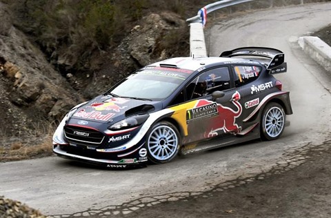 | Le Français Sébastien Ogier au volant de sa Ford lors de la spéciale No3 du 86e Monte-Carlo, entre Vitrolles et Oze, le 28 janvier 2018. |
