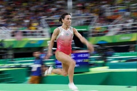 | L'Ouzbèke Oksana Chusovitina, lors du concours du saut de cheval, le 14 août 2016 aux Jeux olympiques à Rio de Janeiro. |