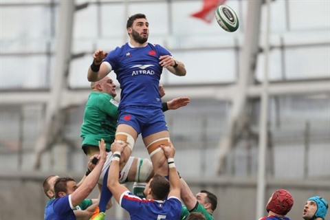 | Charles Ollivon avec le XV de France à la réception d'une touche contre l'Irlande en Six Nations à Dublin, le 14 février. |