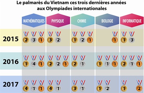 Depuis 40 ans, des centaines d’élèves vietnamiens se sont inscrits aux Olympiades internationales, notamment trois compétitions majeures : mathématiques, physique et chimie. Dans la collection de médailles obtenues, l’or a été de plus en plus présent d’années en années, permettant au pays d’être parmi les premiers de ces compétitions mondiales réservées aux lycéens et collégiens.
