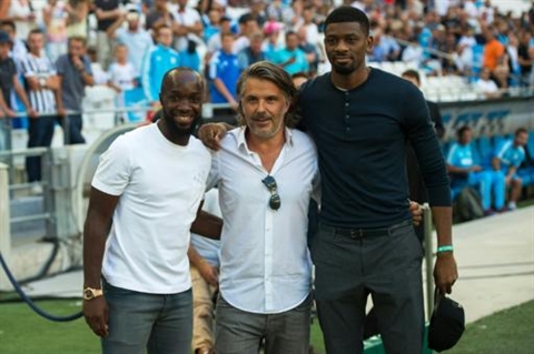 | Le président de l'OM, Vincent Labrune, entouré des recrues Lassana Diarra et Abou Diaby, le 1er août au Vélodrome. |