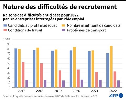 | Graphique montrant les raisons des difficultés d'embauche anticipées par les employeurs pour 2022. |