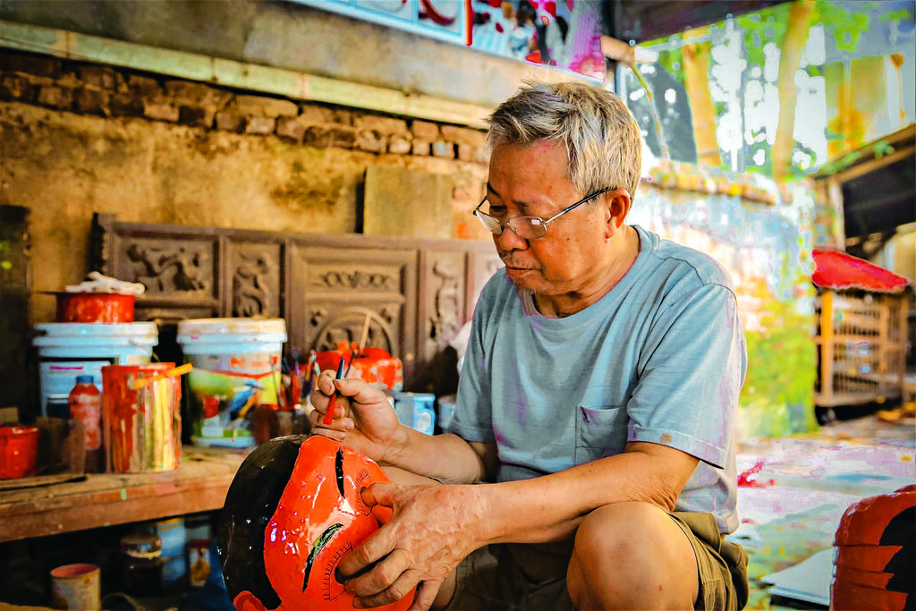 Vu Huy Linh, âgé de 65 ans, exerce ce métier depuis plus de 40 ans. Bien que sa famille fabrique des jouets faits à la main tout au long de l’année, elle est particulièrement occupée du début du 7e mois lunaire jusqu’à la Fête de la mi-automne (le 15e jour du 8e mois lunaire). La plupart de ses produits sont pré-commandés par des clients. Une fois la période de ruée annuelle terminée, sa famille fabrique des cadres pour les masques, les tambours et les têtes de lion en prévision de l’année suivante.