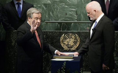 | Antonio Guterres (gauche) prête serment comme secrétaire général de l’ONU face au président de l'Assemblée générale, Peter Thomson, le 12 décembre à New York. |
