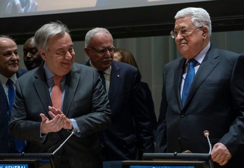 | Le président palestinien Mahmoud Abbas (droite) et le secrétaire général de l'ONU Antonio Guterres, le 15 janvier au siège des Nations unies, à New York. |