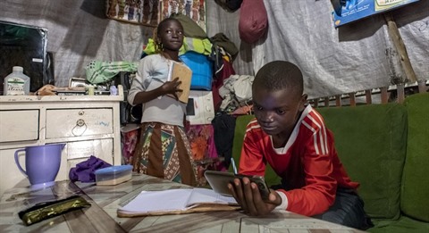 | Samuel, 11 ans, et sa sœur Janet, 10 ans, étudient à l'unique table de leur maison à Mathare, Nairobi, Kenya, en utilisant le téléphone portable de la famille. |