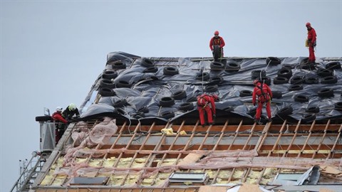 | Des pompiers sur le toit d'une école endommagé par la tempête le 4 février à Bourcefranc-le-Chapus. |