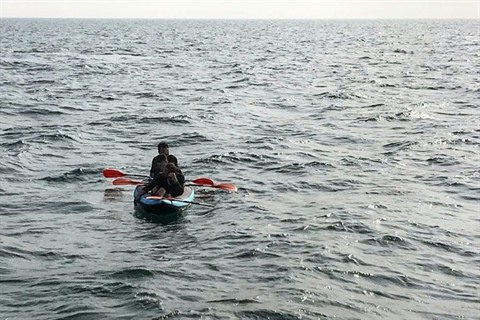| Des migrants, qui tentaient de traverser la Manche, à la dérive sur un canoë avant d'être secourus par les Sauveteurs en mer à Calais, le 4 août. |