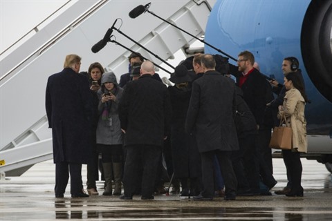 | Le président Trump (premier af gauche) parle aux journalistes le 27 octobre avant d'embarquer dans l'avion présidentiel "Air Force One". |