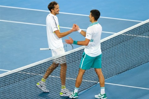 | Le Serbe Novak Djokovic (à droite) et le Russe Daniil Medvedev se serrent la main à la suite de la victoire de Djokovic en finale de l'Open d'Australie à Melbourne, le 21 février 2021. |