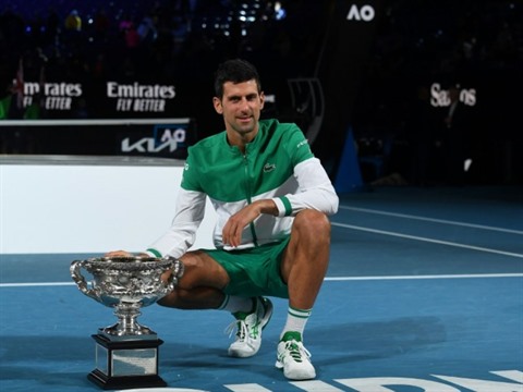 | Le Serbe Novak Djokovic pose avec le trophée, après sa victoire sur le Russe Daniil Medvedev en finale de l'Open d'Australie à Melbourne, le 21 février 2021. |