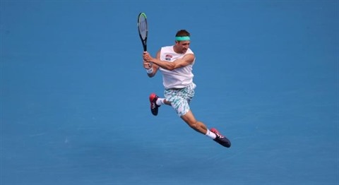 | L'Américain Tennys Sandgren face au Suisse Roger Federer en quart de finale de l'Open d'Australie, à Melbourne, le 28 janvier. |