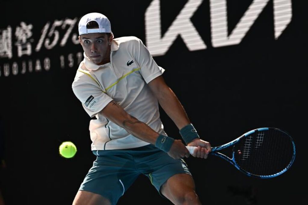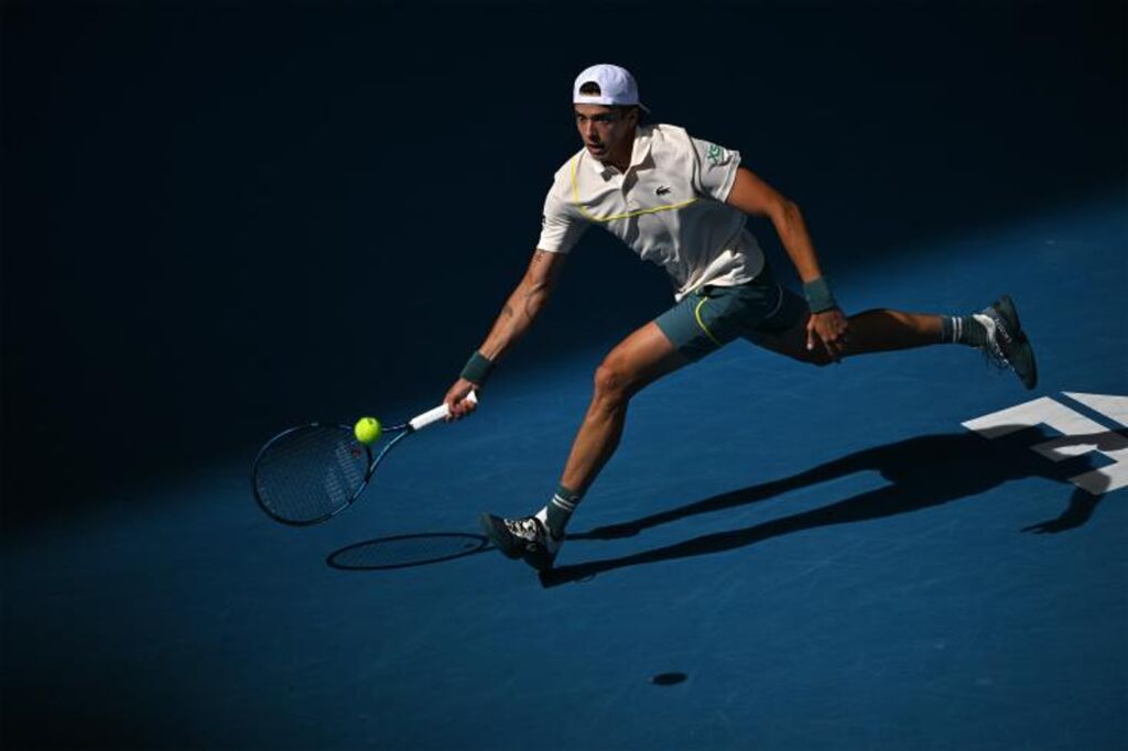 | Le joueur de tennis français Arthur Cazaux renvoie la balle lors de sa défaite contre le Polonais Hubert Hurkacz en huitièmes de finale de l'Open d'Australie à Melbourne. |
