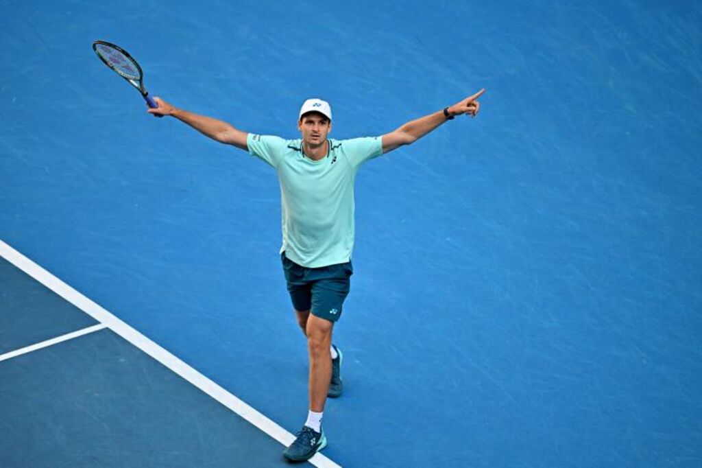 | Le joueur de tennis polonais Hubert Hurkacz célèbre sa victoire contre le Français Arthur Cazaux en huitièmes de finale de l'Open d'Australie à Melbourne le 22 janvier. |