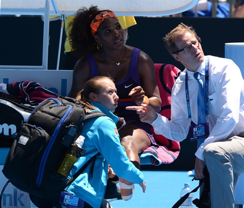 | Serena Williams (centre) se tord violemment la cheville droite au milieu du premier set face à la Roumaine Edina Gallovits-Hall, le 15 janvier à Melbourne. Photo : AFP/VNA/CVN |