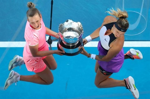 | Elise Mertens et Aryna Sabalenka sautent de joie après leur victoire en finale du double dames de l'Open d'Australie le 19 février au Melbourne Park. |