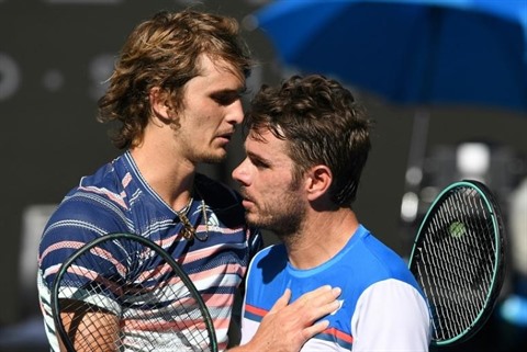 | L'Allemand Alexander Zverev (gauche) salue le Suisse Stan Wawrinka après l'avoir battu en quarts de finale de l'Open d'Australie, le 29 janvier à Melbourne. |