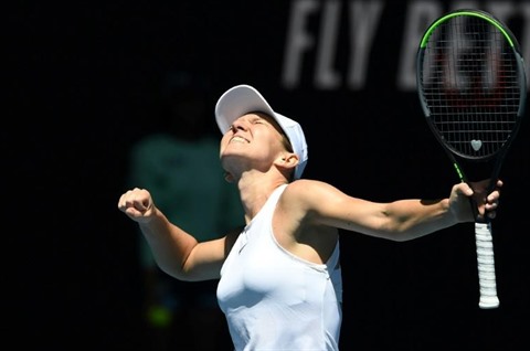 | La Roumaine Simona Halep exulte apès sa victoire face à l'Estonienne Anett Kontaveit, en quarts de finale de l'Open d'Australie, le 29 janvier à Melbourne. |