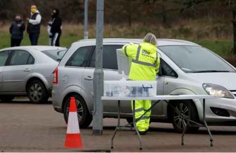 | Un automobiliste vient chercher un test de dépistage du COVID-19, le 1er février à Woking, au Sud-Ouest de Londres. |