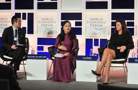 | La ministre vietnamienne de la Santé, Nguyên Thi Kim Tiên (centre), lors de la table ronde à Hanoï. |