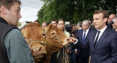 | Le président de la République, Emmanuel Macron (droite), visite un établissement scolaire agricole à Verneuil-sur-Vienne, le 9 juin. |