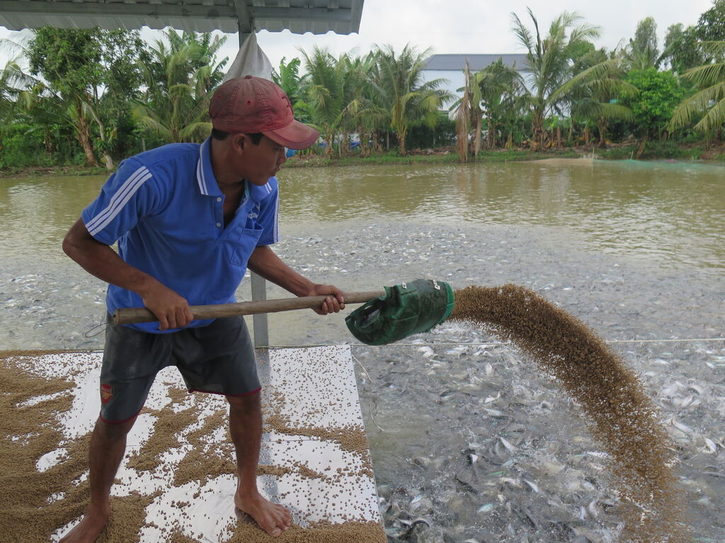 | Un éleveur de la province d’An Giang (Sud) distribue de la nourriture pour les poissons. |