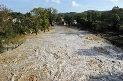 | La rivière Alzon en crue, à Collias, dans le Gard, le 10 octobre. |