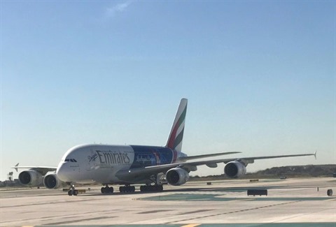 | Un Airbus d'Émirates sur le tarmac de l'aéroport de Los Angeles, le 30 janvier. |