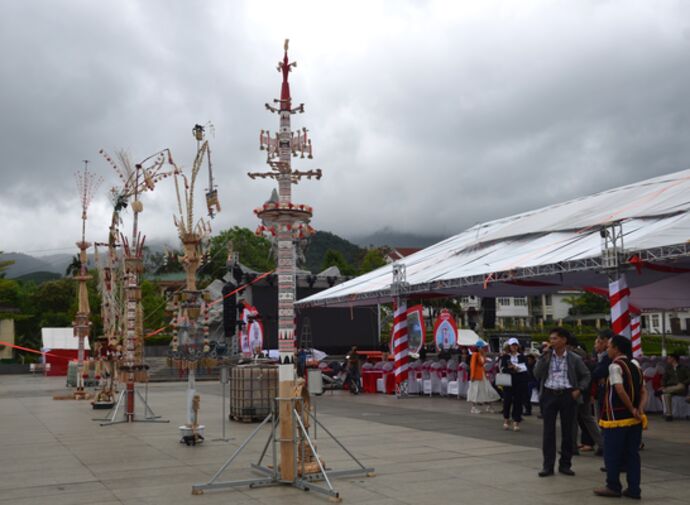 | Cérémonie d’installation du mât rituel. |