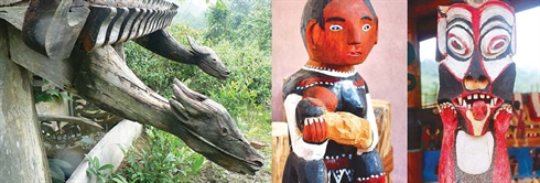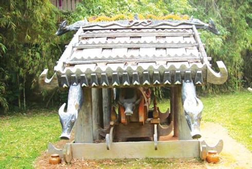 | Les têtes de buffles et les sculptures de bois sont indispensables dans une maison funéraire des Co Tu. |