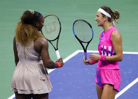 | Serena Williams (gauche), vaincue par Victoria Azarenka en demi-finale de l'US Open, à New York le 10 septembre. |