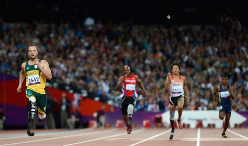 | Le Sud-Africain Oscar Pistorius (gauche) en compétition, le 1er septembre aux Jeux paralympiques de Londres. |