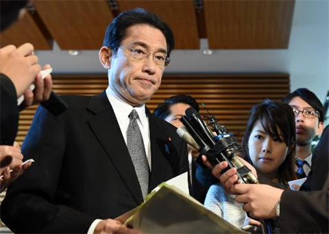 | Le ministre japonais des Affaires étrangères Fumio Kishida entouré de journaistes, le 23 janvier à Tokyo |