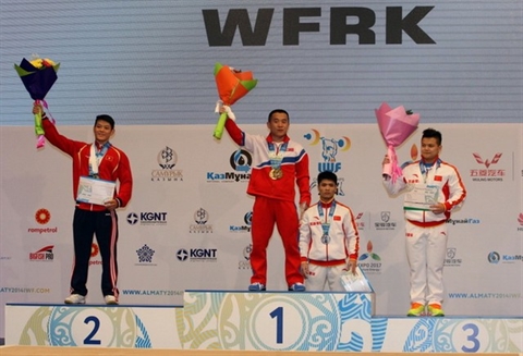 | Thach Kim Tuân (gauche) sur le podium des Championnats du monde 2014 à Almaty, Kazakhstan. |