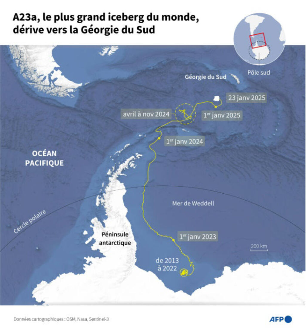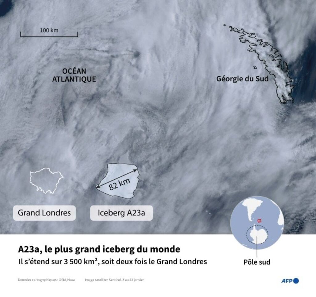 Cet immense plateau de glace - 30 fois plus vaste que Paris - qui s'éloigne depuis des années de l'Antarctique, se dirige désormais vers l'île britannique de Géorgie du Sud, un site important pour la reproduction de la faune sauvage.