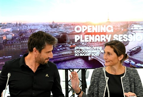 | Le président du Comité d'organisation des Jeux olympiques et paralympiques de Paris 2024, Tony Estanguet, aux côtés de la ministre des Sports et des JO, Amélie Oudéa-Castéra, dans le cadre de la Comission de coordination du CIO, le 30 août à Saint-Denis. |
