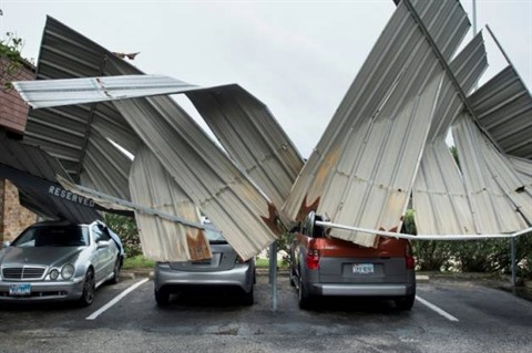 | Des voitures et des tôles après le passage de l'ouragan Harvey à Galveston au Texas, le 26 août. |