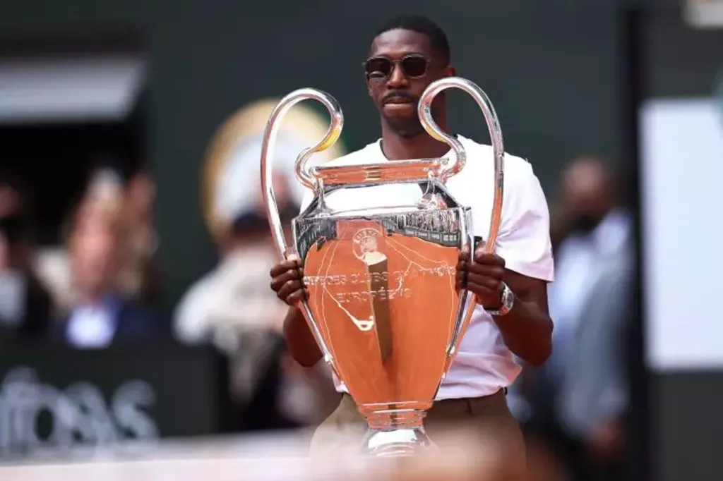 | Ousmane Dembélé présentant le trophée de la Ligue des champions sur le court central de Roland-Garros le 2 juin. |