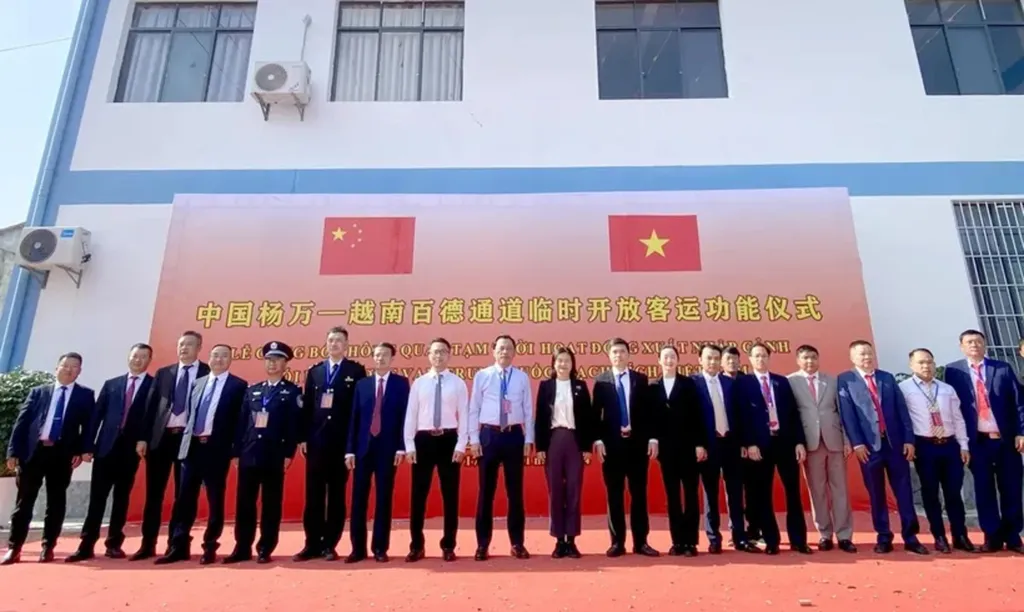 | Les délégués à la cérémonie d'ouverture de deux voies de transport transfrontalières temporaires entre la Chine et le Vietnam. |