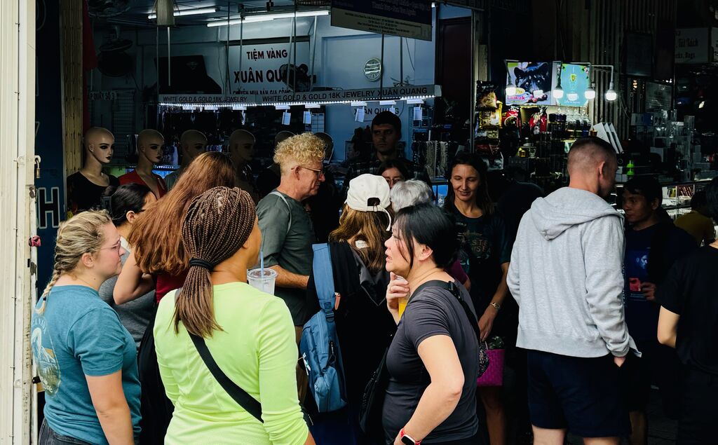 | Touristes étrangers découvrant le marché traditionnel de Bên Thành. |