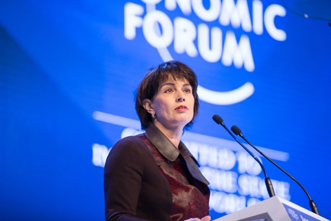 | La présidente suisse Doris Leuthard à la cérémonie d'ouverture de la conférence du Forum économique mondial 2017, le 16 janvier à Davos (Suisse). |