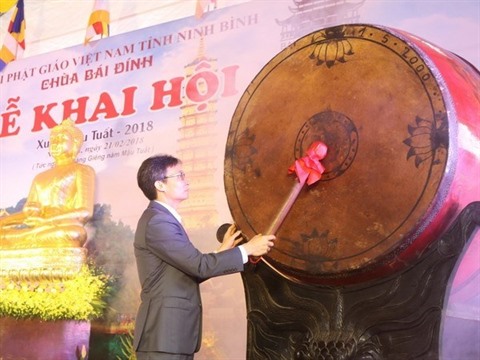 | Le vice-Premier ministre Vu Duc Dam frappe le tambour pour lancer officiellement la fête de la pagode Bai Dinh. |