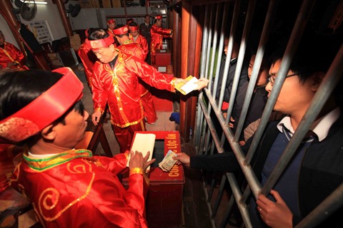 Des dizaines de milliers de pèlerins y sont venus réclamer des vivres. Au total, 37 guichets ont été installés pour la distribution d’environ 150.000 paquets. Tous les printemps, au 14e jour du premier mois lunaire, entre 23h00 et 01h00 du matin, se tient cette fête. Elle rappelle que ce site abrita, selon les historiens, l’entrepôt de vivres de l’armée de Trân Hung Dao durant son combat contre les envahisseurs mongols au XIIIe siècle.