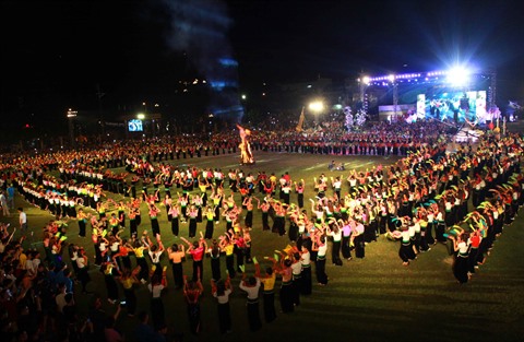 | Spectacle de danse xoe de l'ethnie Thai lors de la cérémonie d'ouverture de la Semaine de la culture et du tourisme de Muong Lo. |